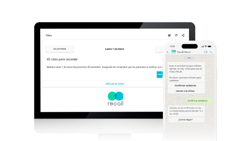 Gracias a Recall puede confirmar, recordar y reagendar con WhatsApp el 80% de las citas en tan solo 1 clic.