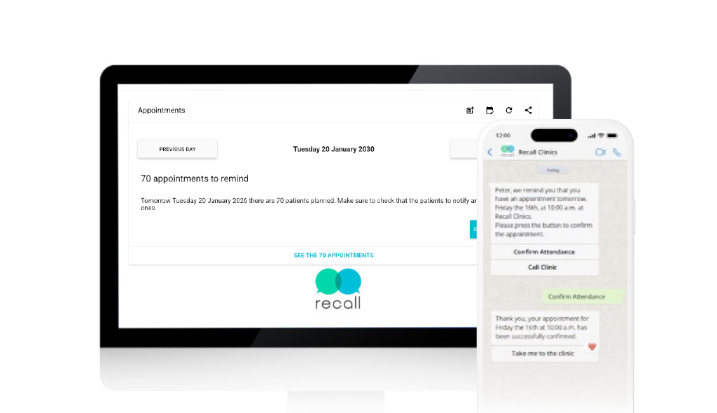 With Recall you can confirm, remind and reschedule 80% of your appointments via WhatsApp in just one click.
